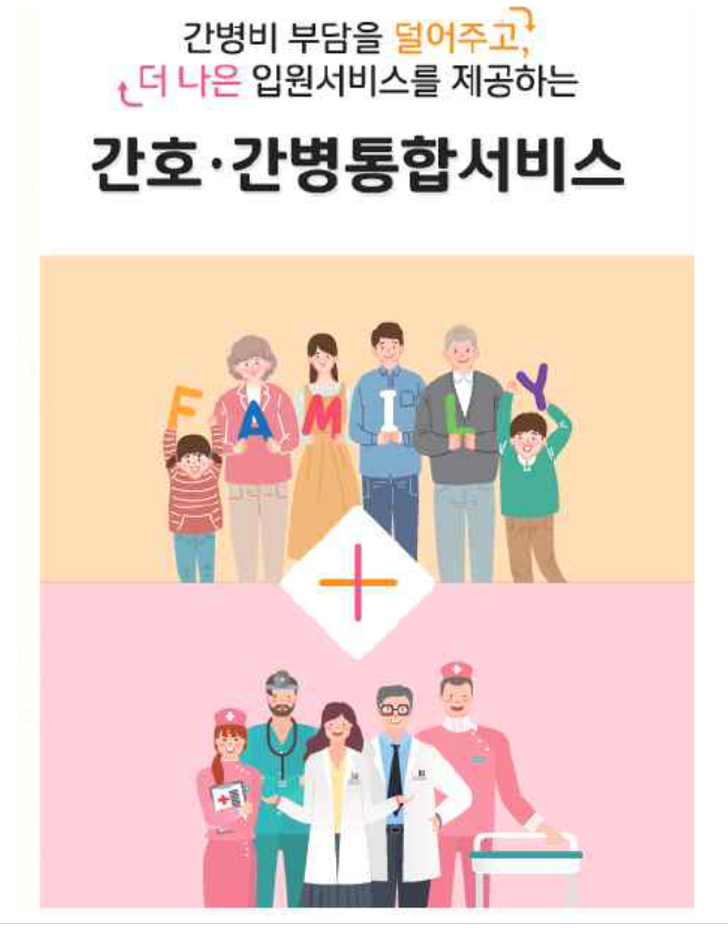 간호간병통합서비스는 보호자나 간병인이 병실에 상주하지 않고, 병원의 간호사, 간호조무사, 간병지원인력이 24시간 입원 환자를 직접 돌보는 국민건강보험공단 제도입니다.