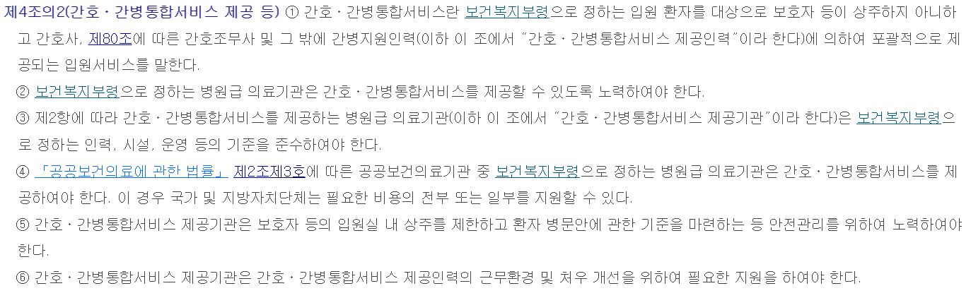 이러한 간병비 부담을 덜기 위하여 간호간병통합서비스라는 제도가 있습니다. 간호간병서비스를 제공하는 병원, 신청방법 이용절차, 기준 등에 대해서 자세히 알아보도록 하겠습니다.