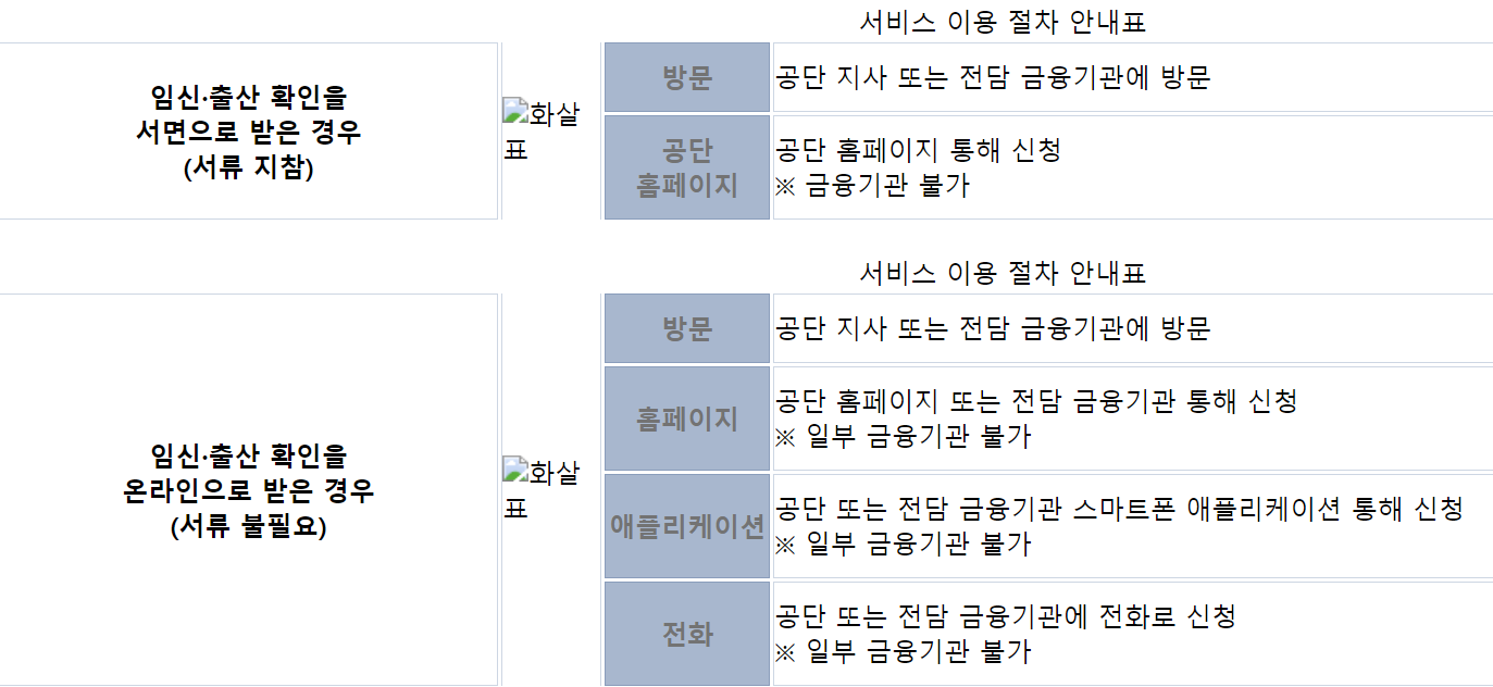 • (방문) 건강보험 임신 출산 진료비 지급 신청서 서류 지참후 전담 금융기관 또는 공단 지사에 방문신청