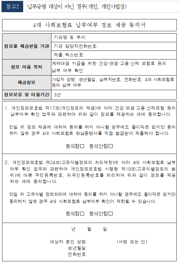 4대보험 미가입, 신규적용 등으로 보험료 고지이력이 없는 경우, 4대 보험료 납부여부 정보제공 동의서 지사 제출시 공문 회신