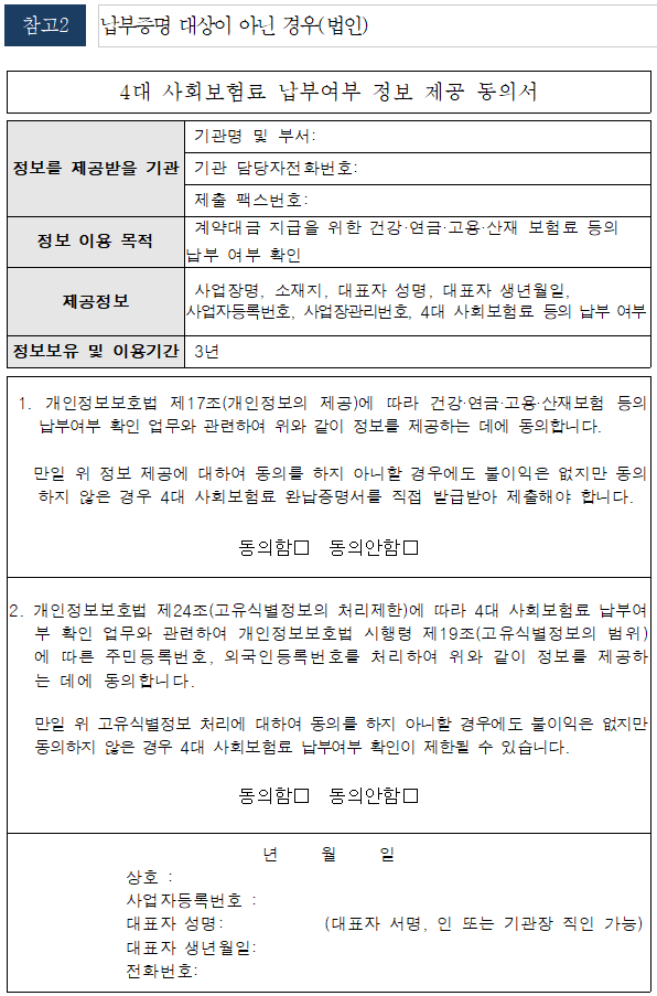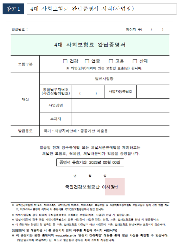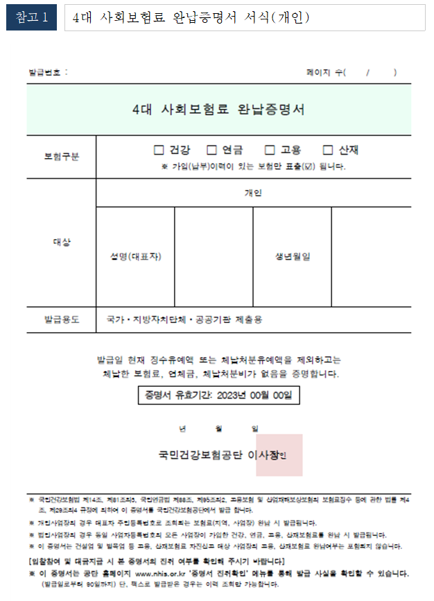 아래는 4대 보험료 완납증명서 서식(개인, 사업장)은 참고 1을 확인하시고, 납부증명 대상이 아닌 경우(사업장, 개인)는 참고 2를 확인하시면 됩니다. 붙임 파일도 있으니 세부기준 등을 확인하시기 바랍니다.
