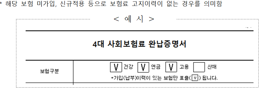 * 4대보험 완납증명서 발급 시 개인(사업장)의 임의 보험구분 선택 불가