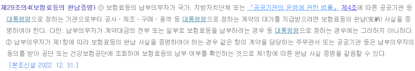법 개정에 따라 2023.7.1일부터 개인 및 사업장이 국가, 지방자치단체, 공공기관에 계약 대금 청구 시 4대 보험 완납증명서 제출 의무화