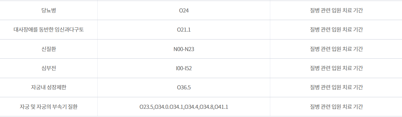 2) 질환기준: 조기진통, 분만관련 출혈, 중증 임신중독증, 양막의 조기파열, 태반조기박리, 전치태반, 절박유산, 양수과다증, 양수과소증, 분만 전 출혈, 자궁경부무력증, 고혈압, 다태임신, 당뇨병, 대사장애를 동반한 임신과다구토, 신질환, 심부전, 자궁내 성장제한, 자궁 및 자궁의 부속기 질환으로 진단받고 입원치료 받은 자