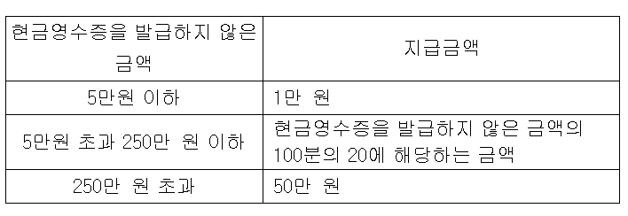소득세법과 법인세법에 따라 현금영수증 발급의무 위반자를 신고한 자에 대한 포상금 지급 규정은 아래와 같습니다.
