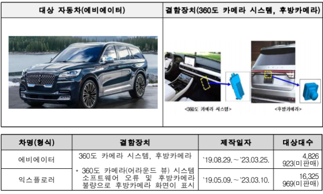 에비에이터 등 3개 차종 25,687대는 360도 카메라 시스템 소프트웨어 오류 및 후방카메라 불량으로 10월 26일부터 시정조치에 들어갑니다.