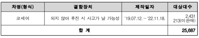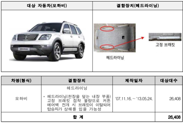 모하비 26,508대는 헤드라이닝(천장을 덮는 내장 부품) 고정 부품 제조 불량으로 11월 1일부터 시정조치에 들어갑니다.