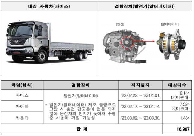 파비스 등 3개 차종 16,967대는 발전기(알터네이터) 제조 불량으로 11월 7일부터 시정조치에 들어갑니다.