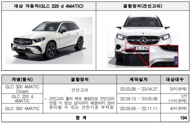 GLC 220d 4 MATIC 등 3개 차종 194대는 견인고리 홀의 제조 불량으로 견인고리 연결이 제대로 되지 않아 안전기준에 부적합하여 10월 27일부터 시정조치에 들어갑니다.