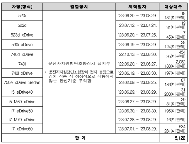 740i 등 13개 차종 5,122대는 운전자지원첨단조향장치가 안전기준에 부적합하여 10월 26일부터 시정조치에 들어갑니다.