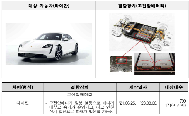 타이칸 970대는 고전압배터리 습기 유입에 따른 화재 발생 가능성으로 11월 3일부터 시정조치에 들어갑니다.