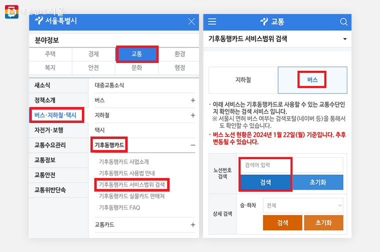 ② 분야별 정보 → 교통 → 버스·지하철·택시 → 기후동행카드