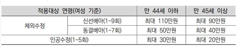 3) 지원 최대금액: 아래표 참조(만 나이는 시술시작시점을 기준)