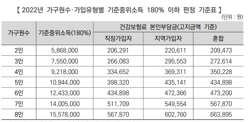 난임부부 건강보험료 본인부담금 고지금액 기준으로 가족수별 건강보험료 기준 중위소득 180% 이하인 가구