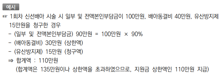 - (비급여) 배아동결비는 최대 30만 원, 착상유도제 및 유산방지제는 각각 20만 원까지 지급가능