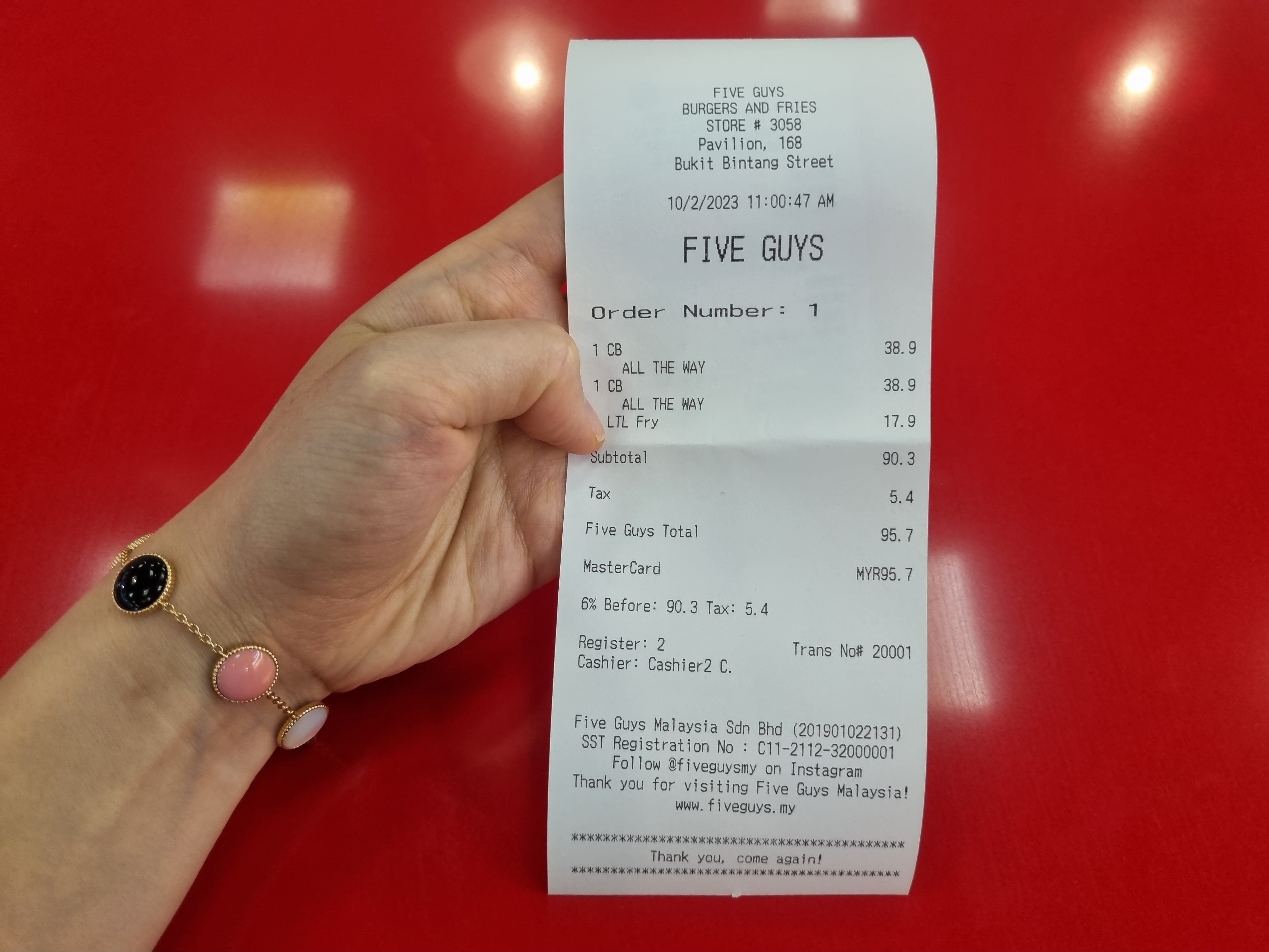 파이브가이즈는 쿠알라룸푸르 파빌리온 쇼핑몰에 있으며, 저는 숙소인 만다린 오리엔탈 호텔에서 약 1.2km 걸어갔습니다.