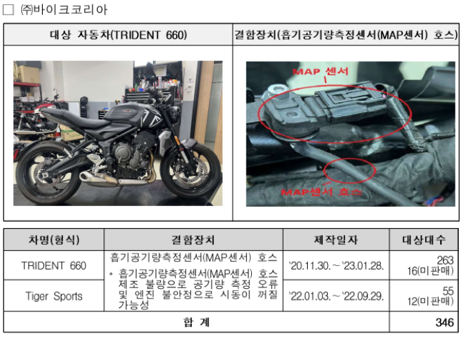 TRIDENT 660 등 2개 차종 346대는 흡기공기량측정센서 호스 불량