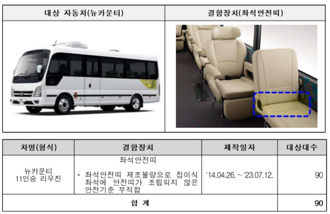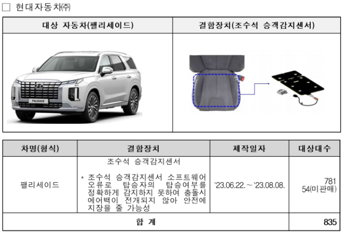 팰리세이드 835대는 조수석 승객 감지센서 소프트웨어 오류, 뉴카운티 90대는 좌석안전띠의 안전기준 부적합