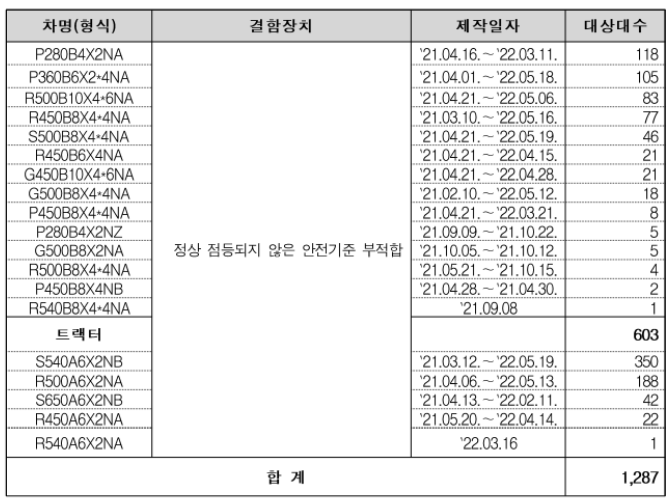 카고트럭 등 2개 차종 1,287대는 등화장치(번호등)의 점등 불량에 따라 안전기준 부적합