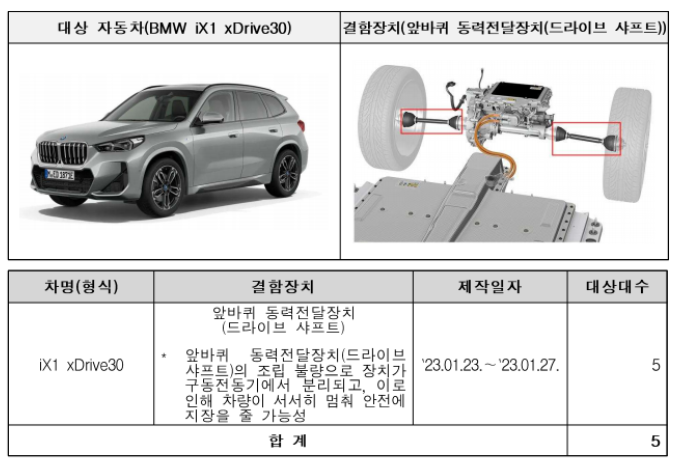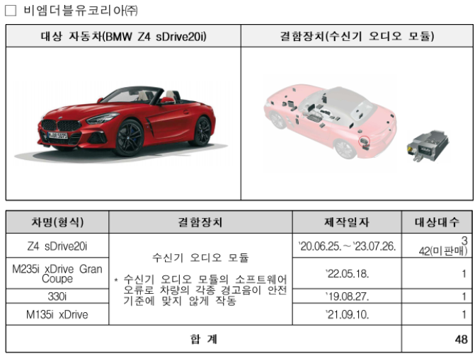 Z4 sDrive20i 등 4개 차종 48대는 수신기 오디오 모듈의 안전기준 부적합, iX1 xDrive30 5대는 앞바퀴 동력전달장치(드라이브샤프트) 조립 불량