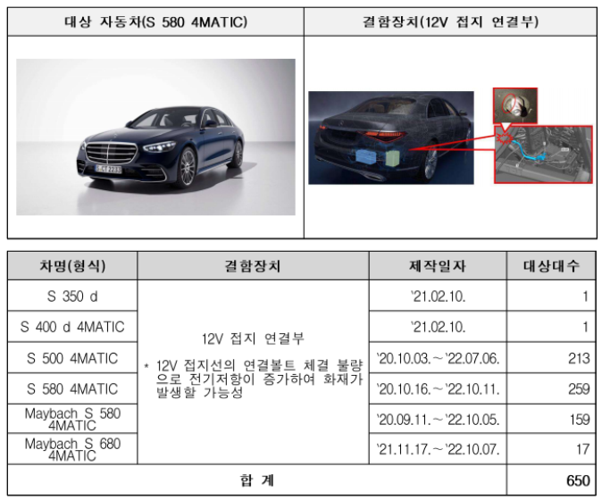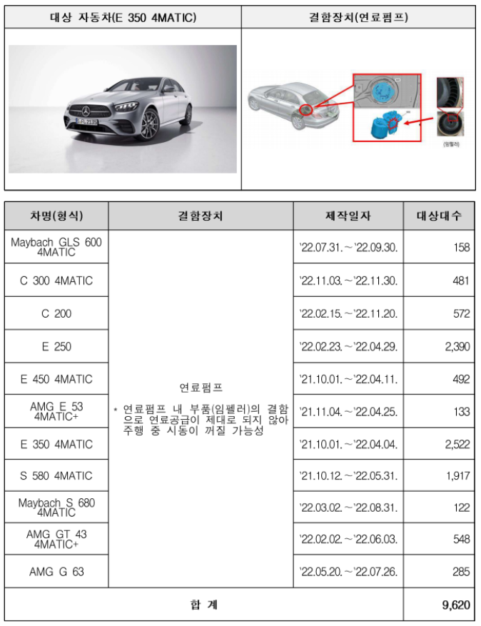 벤츠 E230 4MATIC 등 11개 차종 9,620대는 연료펌프 내 부품(임펠러)의 결함으로 S 580 4 MATIC 등 6개 차종 650대는 12V 접지선의 연결볼트 고정 불량