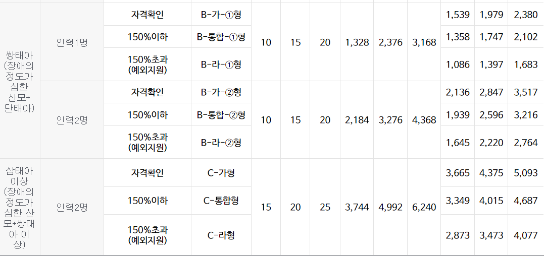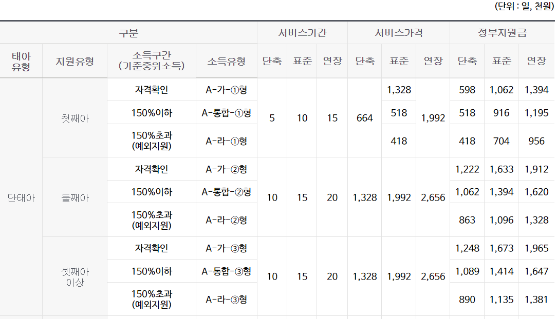 - 정부지원금: 지원유형, 출산순위, 소득수준, 이용자 선택(단축, 표준 연장)에 따라 차등지원