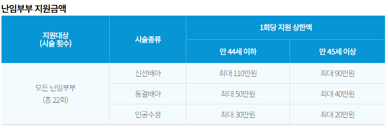 이 두가지가 확대되어, 회당20~110만원 지원을 받을 수 있으며, 시술비는 총22회내에서 1회당 상한액(나이별 시술별)로 지원합니다.