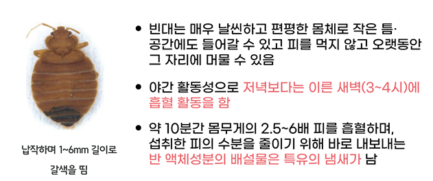 피를 빨아 생명을 유지하는 불쾌곤충으로 전 세계에서 발견되며, 감염병을 옮기지는 않으나 낮에 가구, 침대, 벽 틈 등에 숨어 있다가 주로 잠자는 동안 노출된 피부를 물어 붉은 반점, 가려움증을 유발합니다.