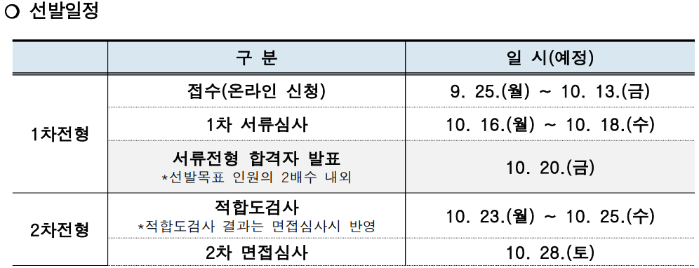 (선발기준) 지원동기 및 업무적합성(30점), 사업 및 업무 이해도 (30점), 소통능력(30점), 적응력(10점)에 따라 선정