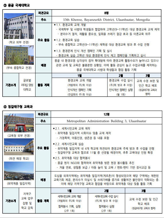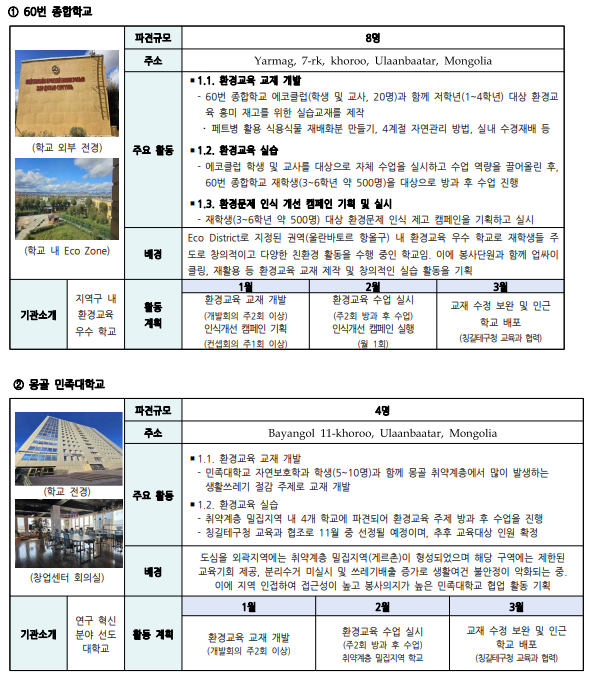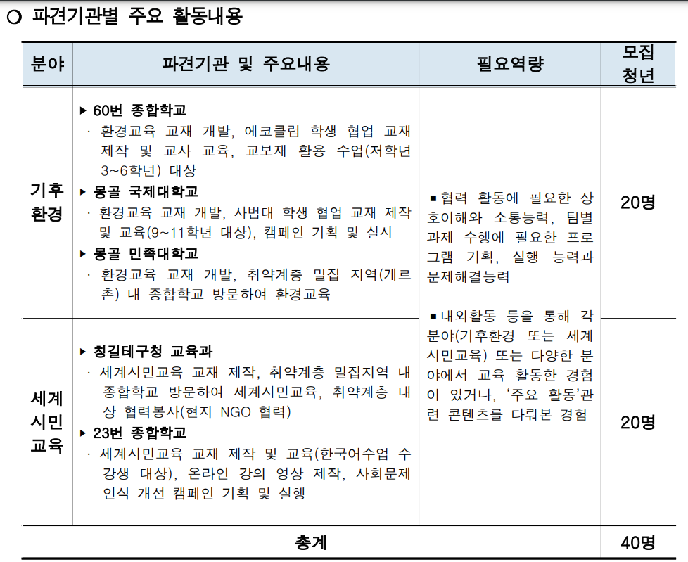 모집인원: 총 파견기관 5개, 40명 모집(기후환경분야 20명, 세계시민교육분야 20명)