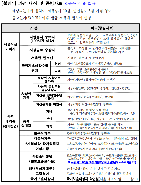 ** 가점대상(서울시정기여자, 사회배려층(취약청년))의 경우 증빙자료 제출 시 중복 없이 가점 부여(서류 10점, 면접 5점)