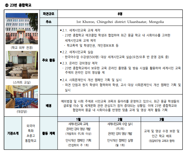 (교육내용) 국제개발협력의 이해, 타문화의 이해, 파견국가 생활정보, 현지어 학습, 팀별 워크숍 등