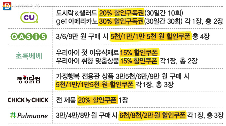 3월분 할인쿠폰 신청은 2월 20일 0시부터 27일 23시 59분까지 8일간 선착순으로 받는다. 업체별 지원 건수(각 1만건, CU 2만건)가 달성되면 접수를 마감한다. 업체별로 쿠폰 할인율이 다르며, 중복 신청도 가능하다.