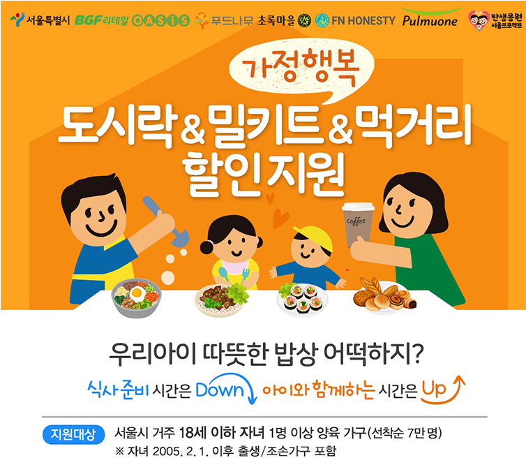 서울시에서 저출생 대책 탄생응원 서울프로젝트의 하나로, 18세 이하 자녀가 있는 가정에서 식사 준비에 드는 시간과 비용을 절약할 수 있도록 '가정행복 도시락, 밀키트, 먹거리 할인지원 사업'을 확대 추진한다고 합니다