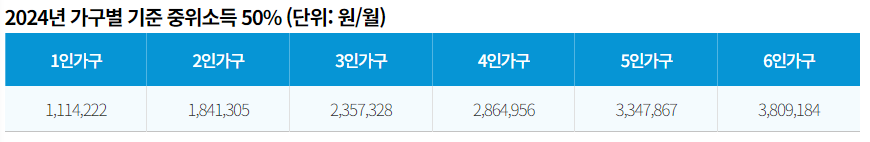 ex) 소득이 없는 1인 가구의 경우 기준 중위소득 85%(189만 4천원) 대비 가구소득 부족분의 절반인 94만 7,000원(월 기준)을 받는다.