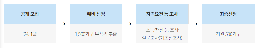지원가구는 신청자들을 통계적 무작위 추출방식으로약 1,500여가구(3배수내외)를 예비선정하고 자격요건에 적합한 가구인지 조사한 후 4월에 최종 500가구 선정