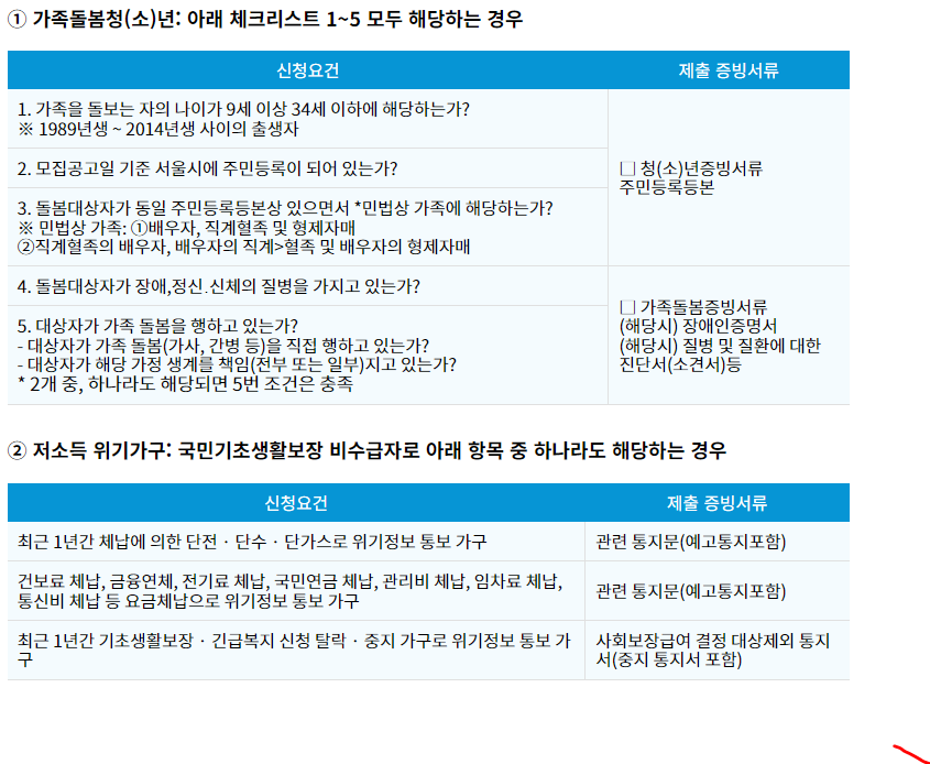 사업 공고일(2023.12.27.)일 현재 주민등록상 서울시에 거주하는 '가족돌봄청(소년)과 저소득 위기가구'로 가구소득이 가구별 기준 중위소득 50% 이하이면서 재산이 3억 2,600만원이하인 가구