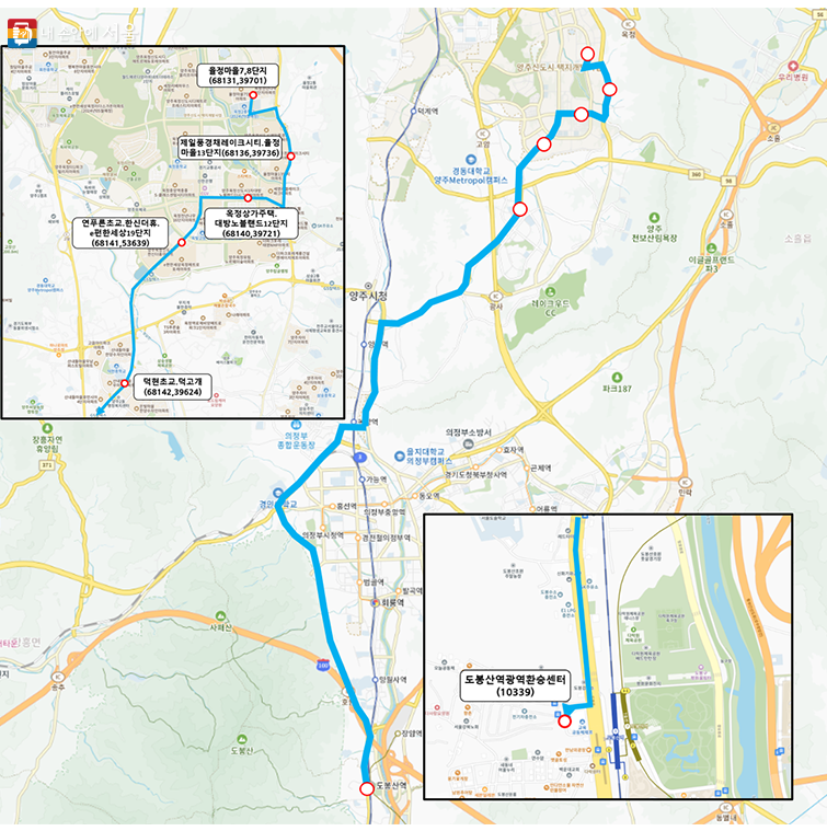 양주시 율정마을 7,8단지> 제일풍경채레이크시티, 율정마을 13단지> 옥정상가주택, 대방노블랜드 12단지> 연푸른 초교, 한신더휴, e 편한 세상 19단지> 덕현초교, 덕고개> 도봉산역광역환승센터