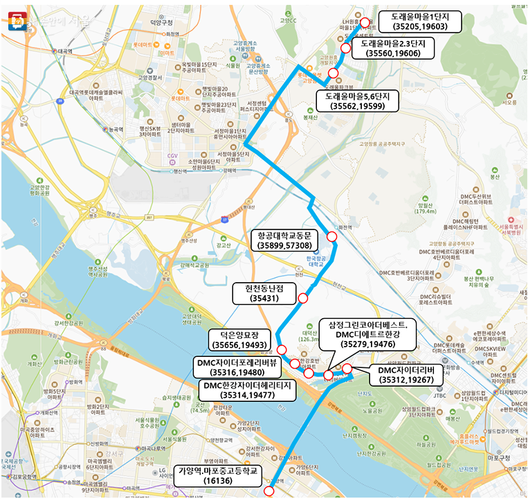 서울시 도래울마을 1단지> 도래울마을 2,3단지> 도래울마을 5,6단지> 항공대학교동문> 현천동난점> 덕은양묘장> DMC자이더포레리버뷰> DMC한강자이더해리티지> 삼정그린코아더베스트 DMC디베트로 한강> DMC자이더리버> 가양역, 마포중고등학교
