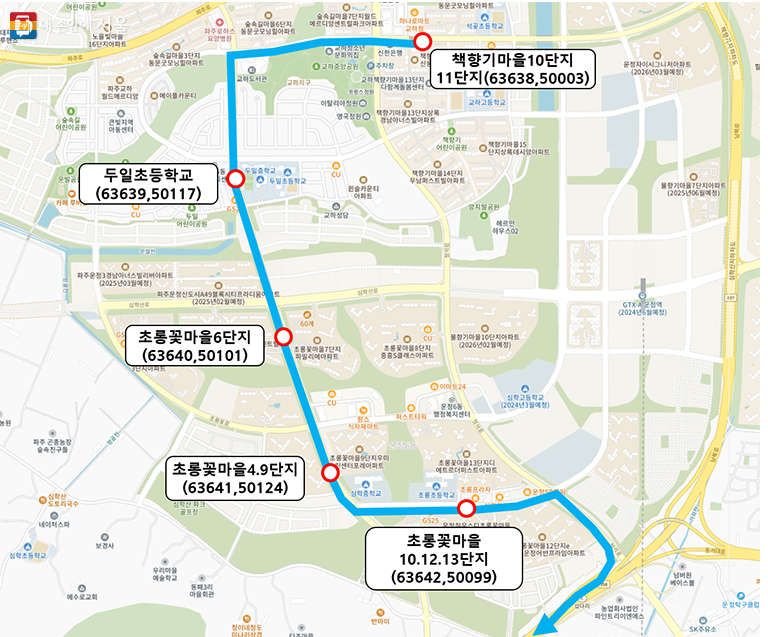 파주시 책향기마을 10단지, 11단지> 두일초등학교> 초롱꽃마을 6단지> 초롱꽃마을 4,9단지 > 서울시 합정역 > 홍대입구역