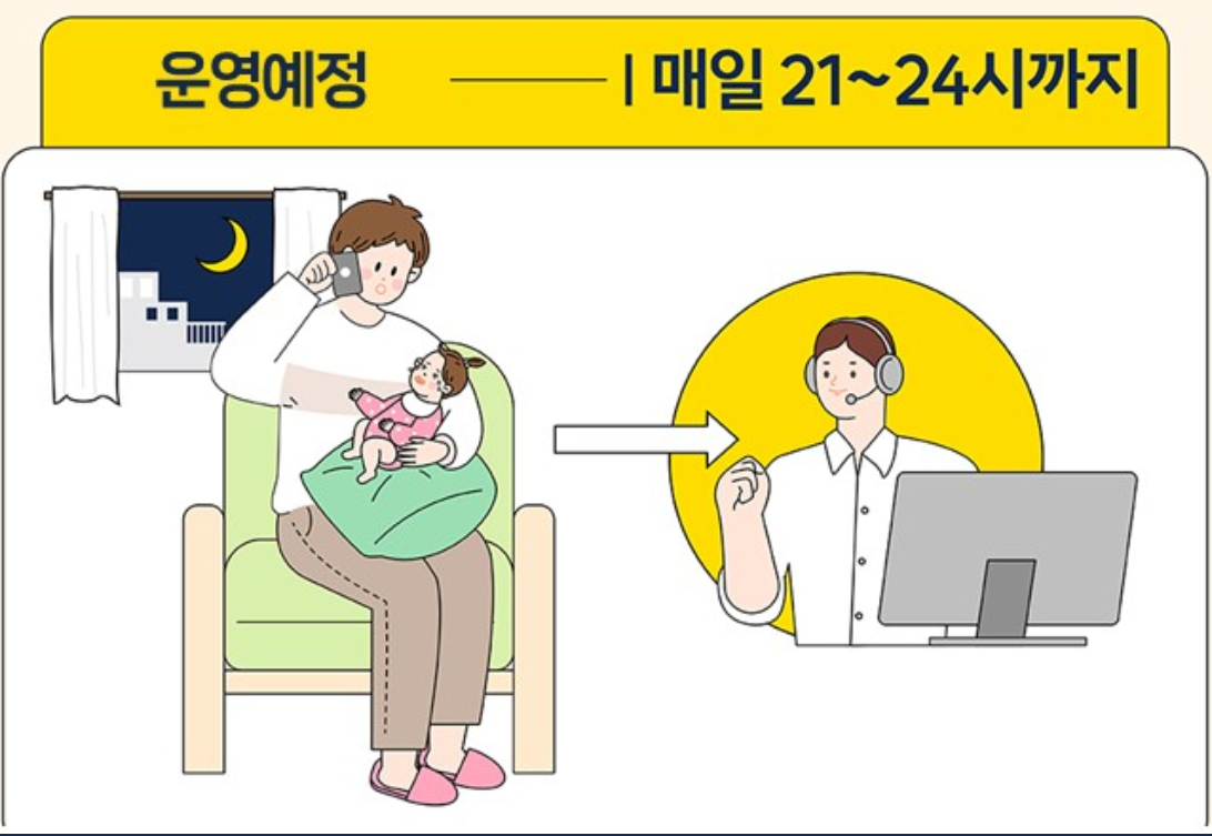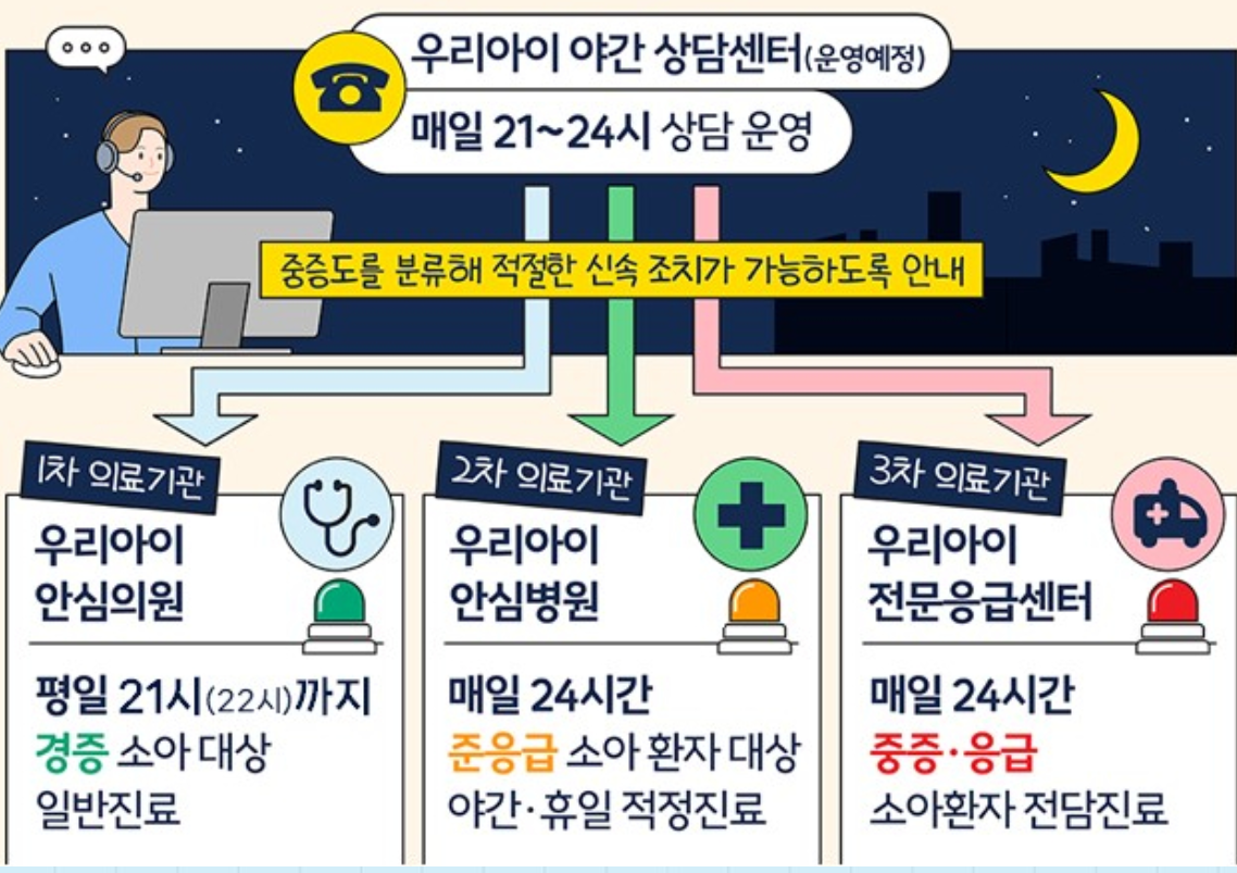 야간에 아이가 아플 때 병원에 가야 할지, 말아야 할지 고민하는 부모님들을 위해 증상에 맞는 전문적인 상담을 제공하는 우리 아이 야간상담센터가 운영될 예정입니다.(매일 21~24시까지)