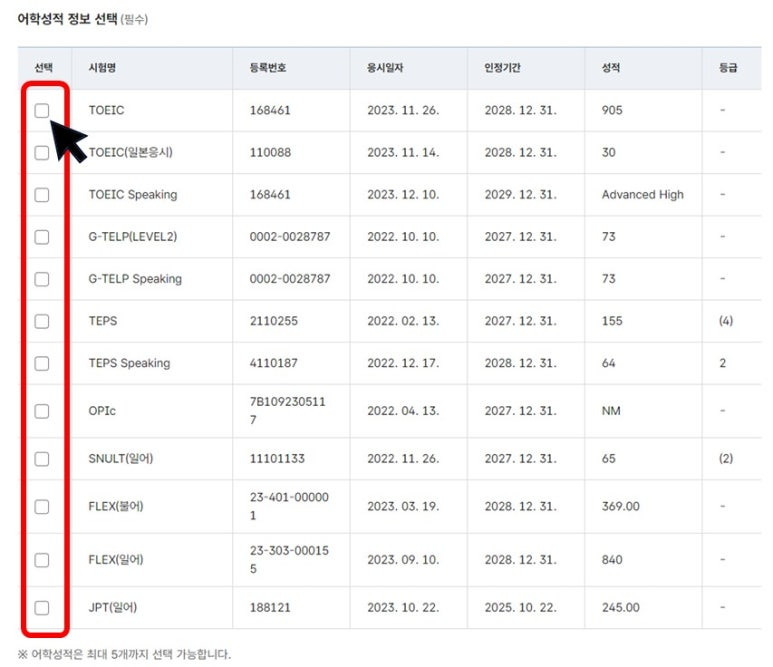 한 장의 확인서에 발급 할 수 있는 어학성적은 최대 5개까지입니다.