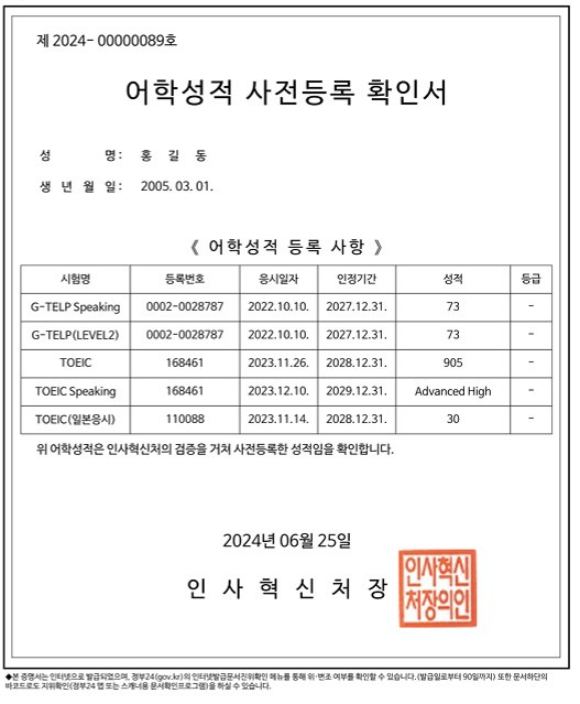 어학성적 사전등록 확인서 교부 | 민원 안내 및 신청 | 정부24