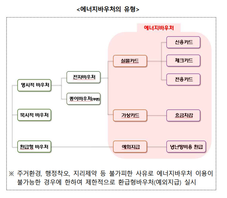 에너지 취약계층에 에너지 바우처를 지급하여 전기, 도시가스, 지역난방, 등유, LPG, 연탄을 구입할 수 있도록 지원하는 제도