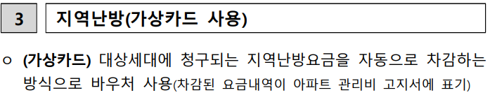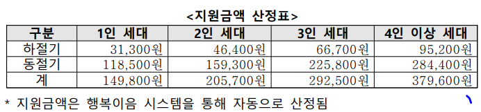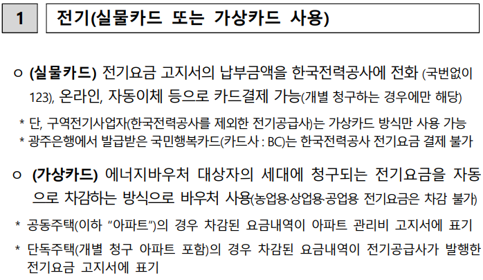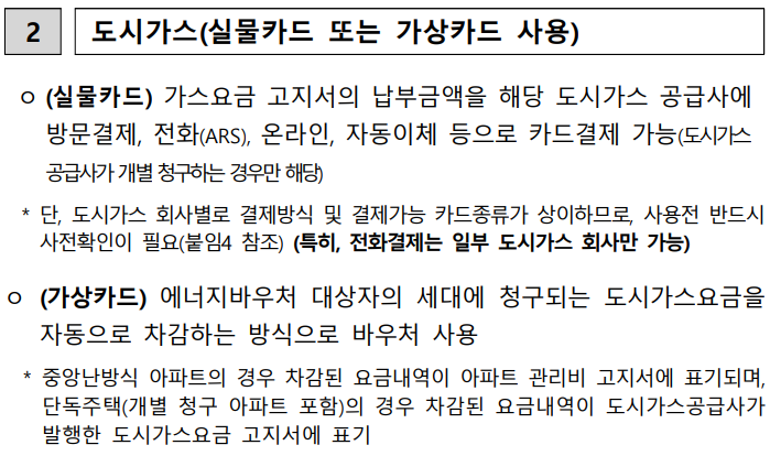 (동절기) 전기, 도시가스, 지역난방, 연탄, 등유, LPG 등 난방 에너지원을 선택적으로 구입, 사용할 수 있는 바우처 지급