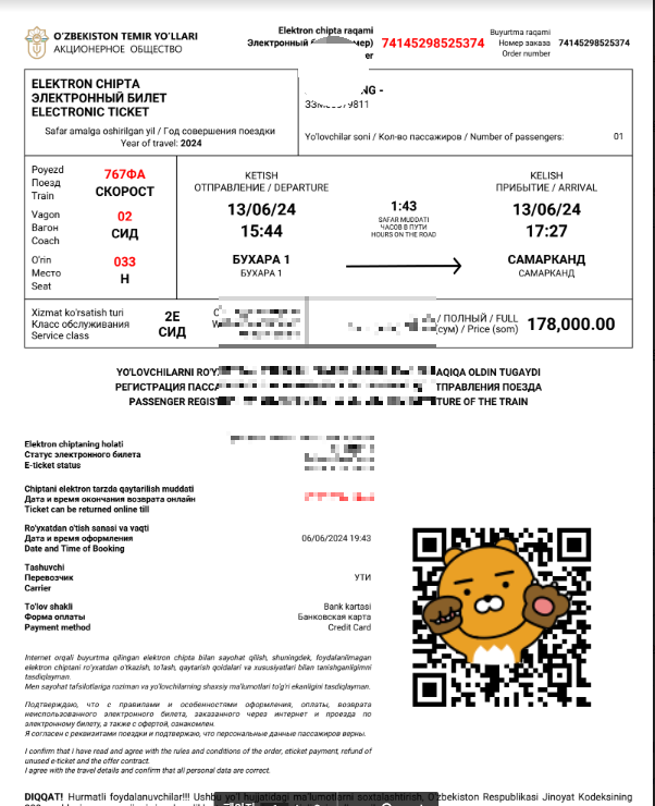 우즈베키스탄 기차표 금액 및 티켓 수령방법