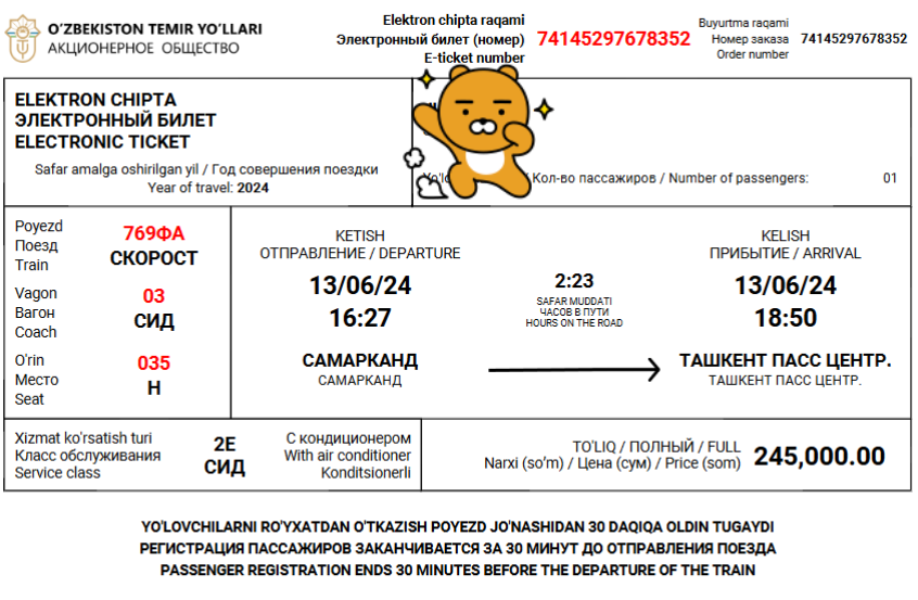 저희는 타슈켄트 국제공항에서 오후 10시 비행기를 타기 위하여 사마르칸트에서 16시27분에 출발하여 18시 50분에 타슈켄트 기차역에 도착하는 고속열차를 예매하였습니다.