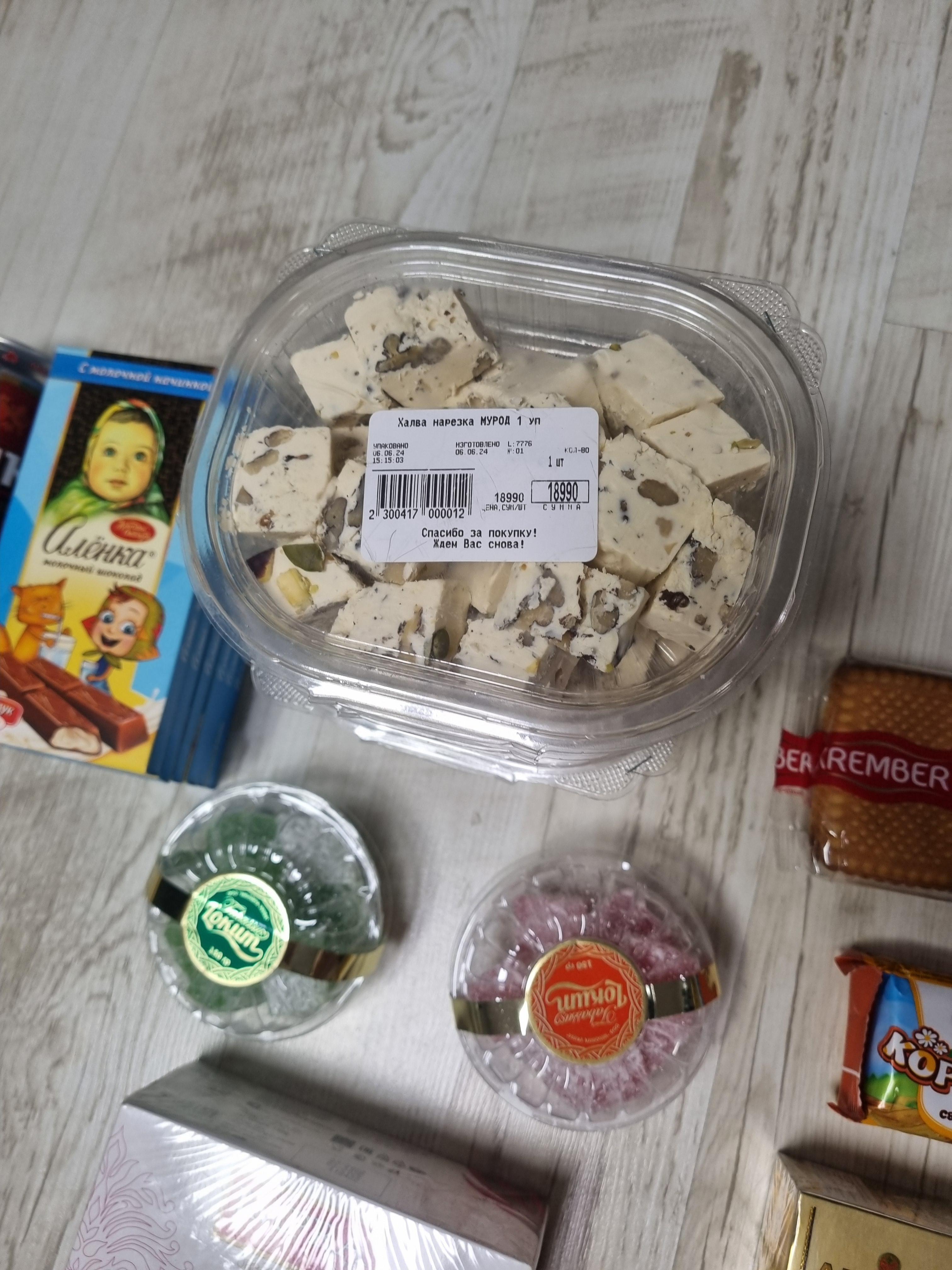 Korzinka에서구매한 Halva같은 견과류가 들은 분유를 엄청 달게 뭉친 그런 간식?인것 같습니다.