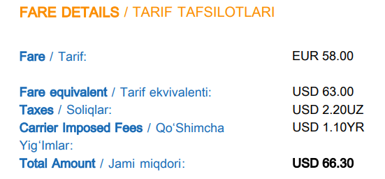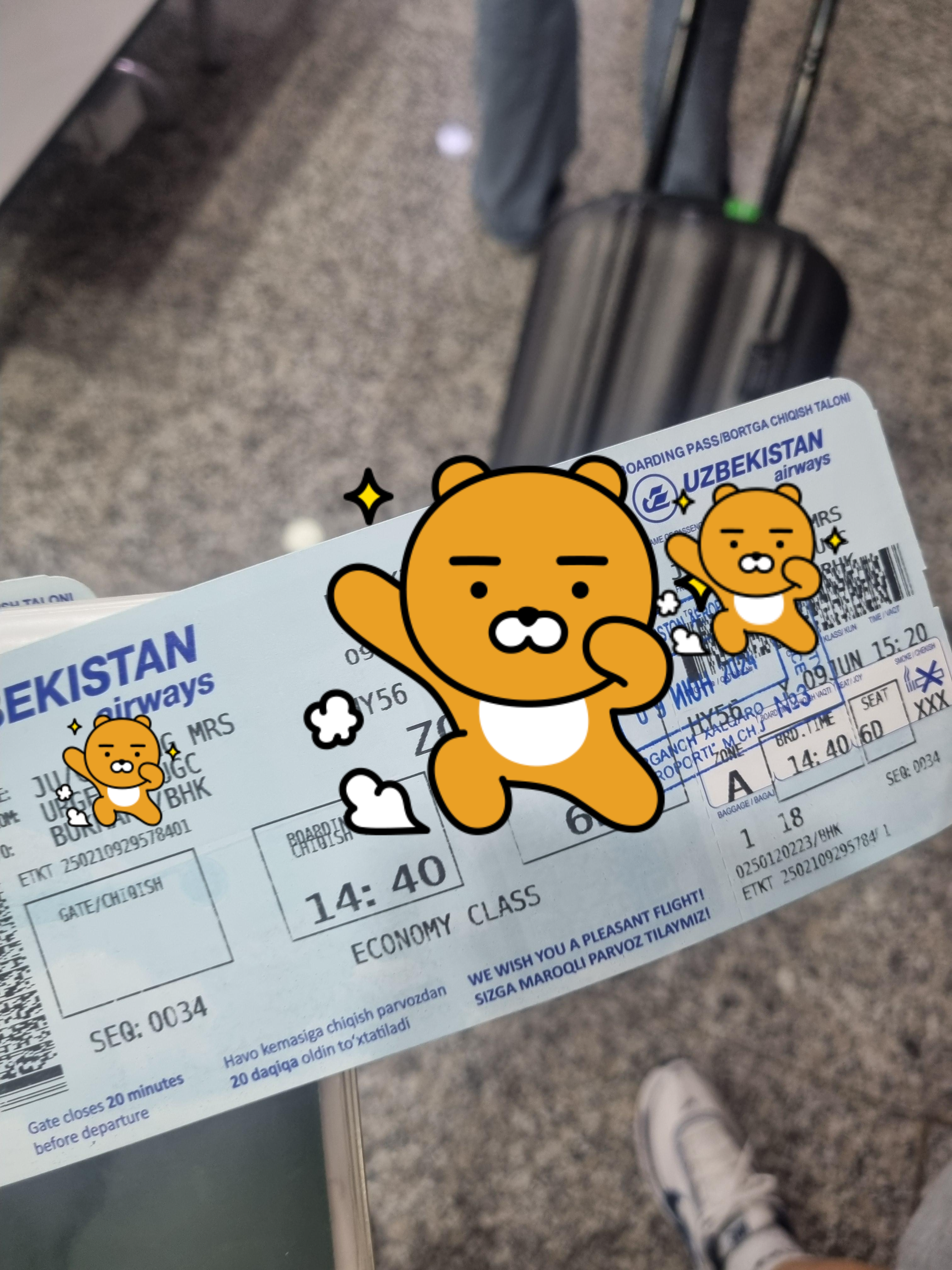 구매금액: 1인당 23kg 수화물 포함하여 1인당 66.30달러 들었습니다. 우르겐치공항에서 부하라 공항까지 항공편이 하루에 한 번 아니면 두 번, 어떤 요일에는 없을 수 도있으니 꼭 미리 확인해 보세요!
