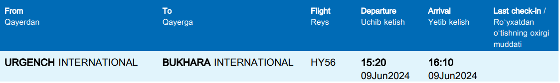 구매금액: 1인당 23kg 수화물 포함하여 1인당 66.30달러 들었습니다. 우르겐치공항에서 부하라 공항까지 항공편이 하루에 한 번 아니면 두 번, 어떤 요일에는 없을 수 도있으니 꼭 미리 확인해 보세요!